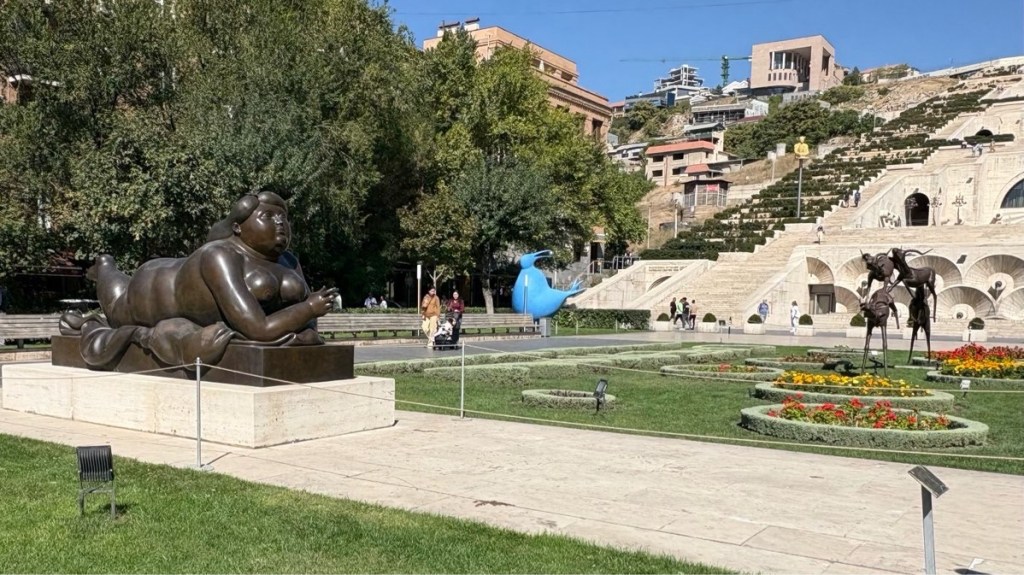 A bit of fun and fresh air next. We went to the Cascade Complex, a multi-terraced construction of stairs and gardens on the outside and a contemporary art museum on the inside with many sculptures both inside and out. The government paid for the building, an American-Armenian, Cafesjian, donated 5,000 pieces of art. As it was a warm day we conserved our energy and took the 7 sets of escalators up, and walked the 572 steps back down.