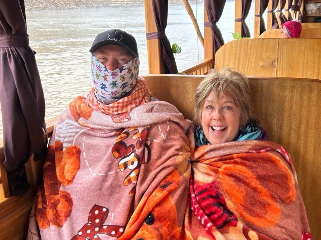 An early 6am start as we’ve once again a very long travel day ahead. The sky was just lightening as we boarded the Jungle Queen yet a heavy mist continued to shroud the hilltops for the next couple of hours. The hotel had provided a bagged breakfast so we huddled under our blankets with warm coffee and our victuals as we got under way.