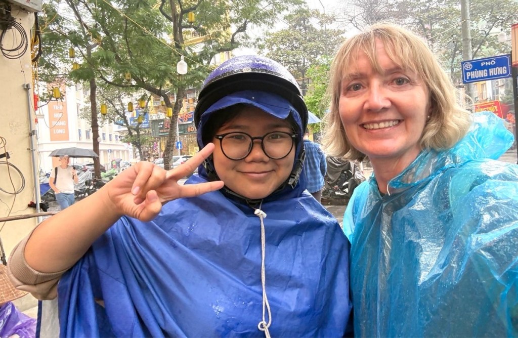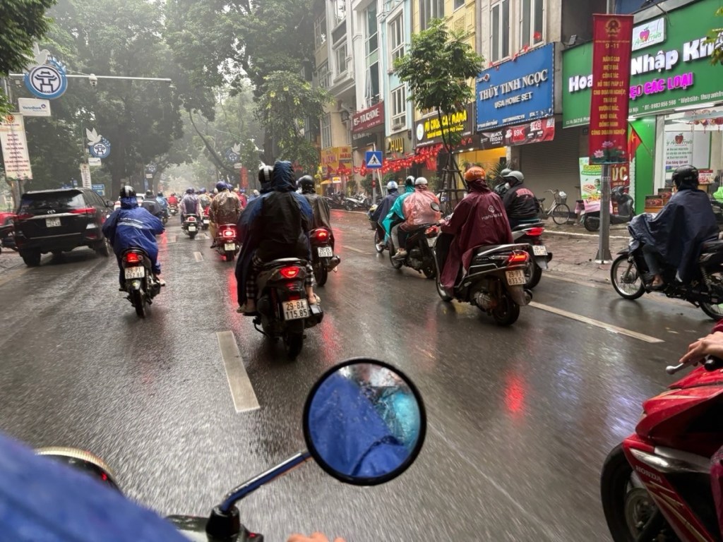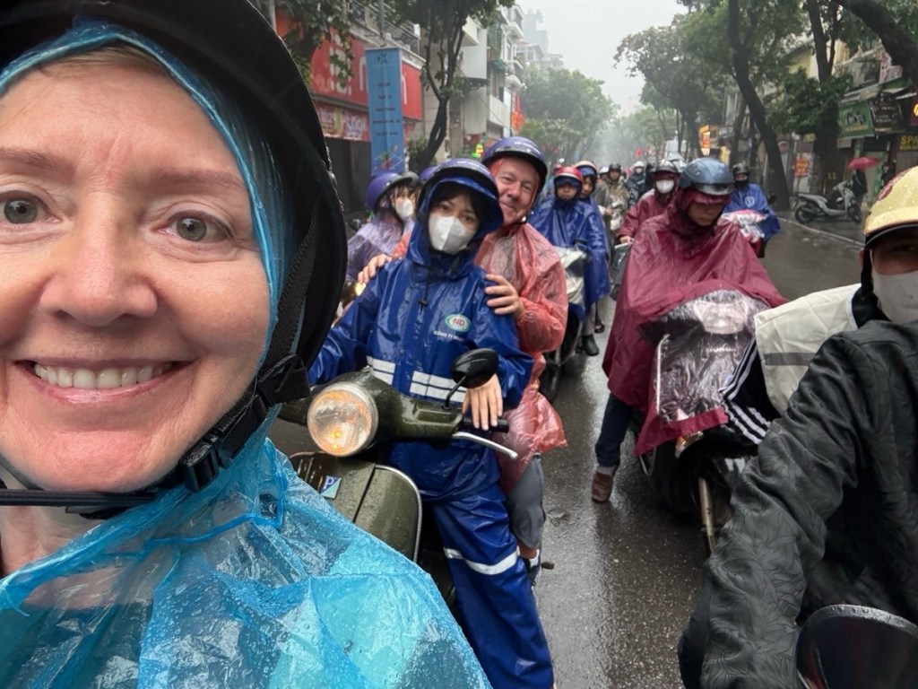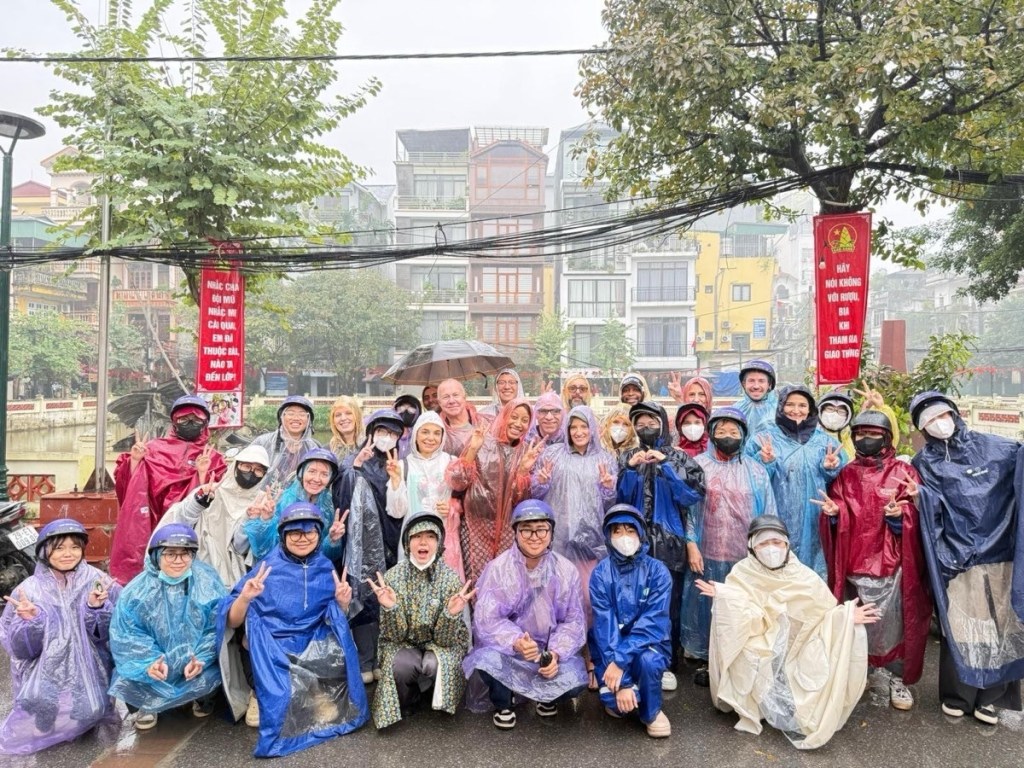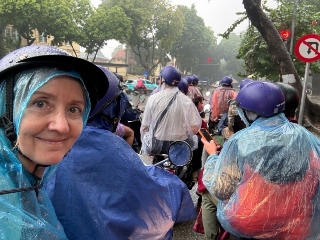 Woke up to 100% chance of rain all day and AQI of 222. The elements were against us. Plastic rain ponchos were handed out as the morning consisted of riding around town on the back of lady-driven motor scooters.