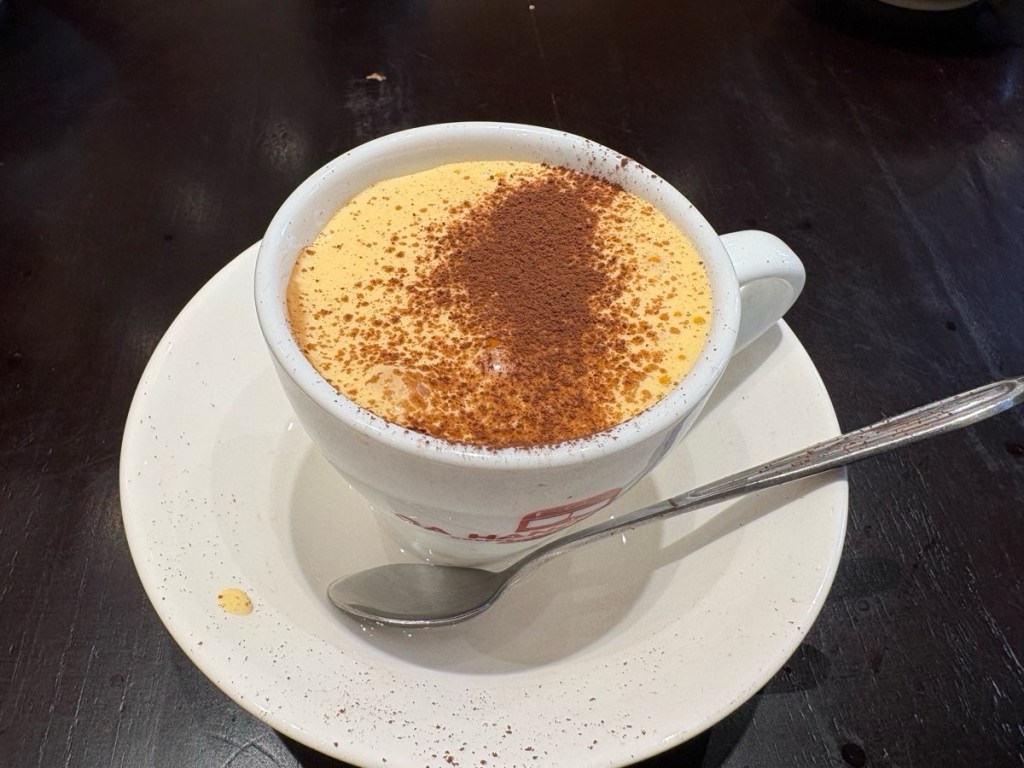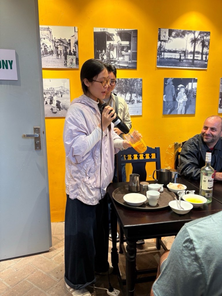 Back on the bikes and our next stop was for some famous egg coffee. Invented in 1940 when milk was hard to find, some guy decided to whip up some egg cream to put in his coffee. Now it’s made with honey, caramel syrup, condensed milk, egg yolk and a touch of rum and it’s the iconic drink of Vietnam. Whipped for 5-8 minutes and a shot of espresso added, it’s a creamy, desserty drink.