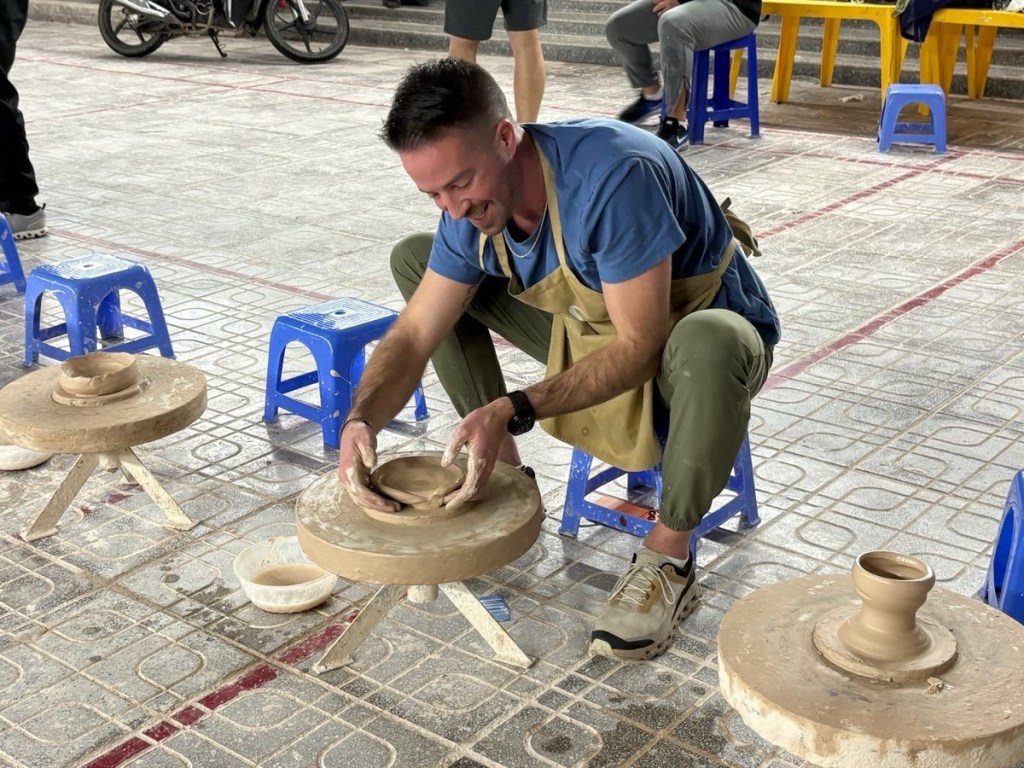 We had a nice break back at the hotel then congregated again in the lobby at 3pm to take a bus out of town to Bat Trang, a ~1000 year old pottery village. We had a short tour of the kilns, actually walking inside one of the 5 beehive shaped kilns, then sat down at a manual potters’ wheel to try our hand at throwing clay.