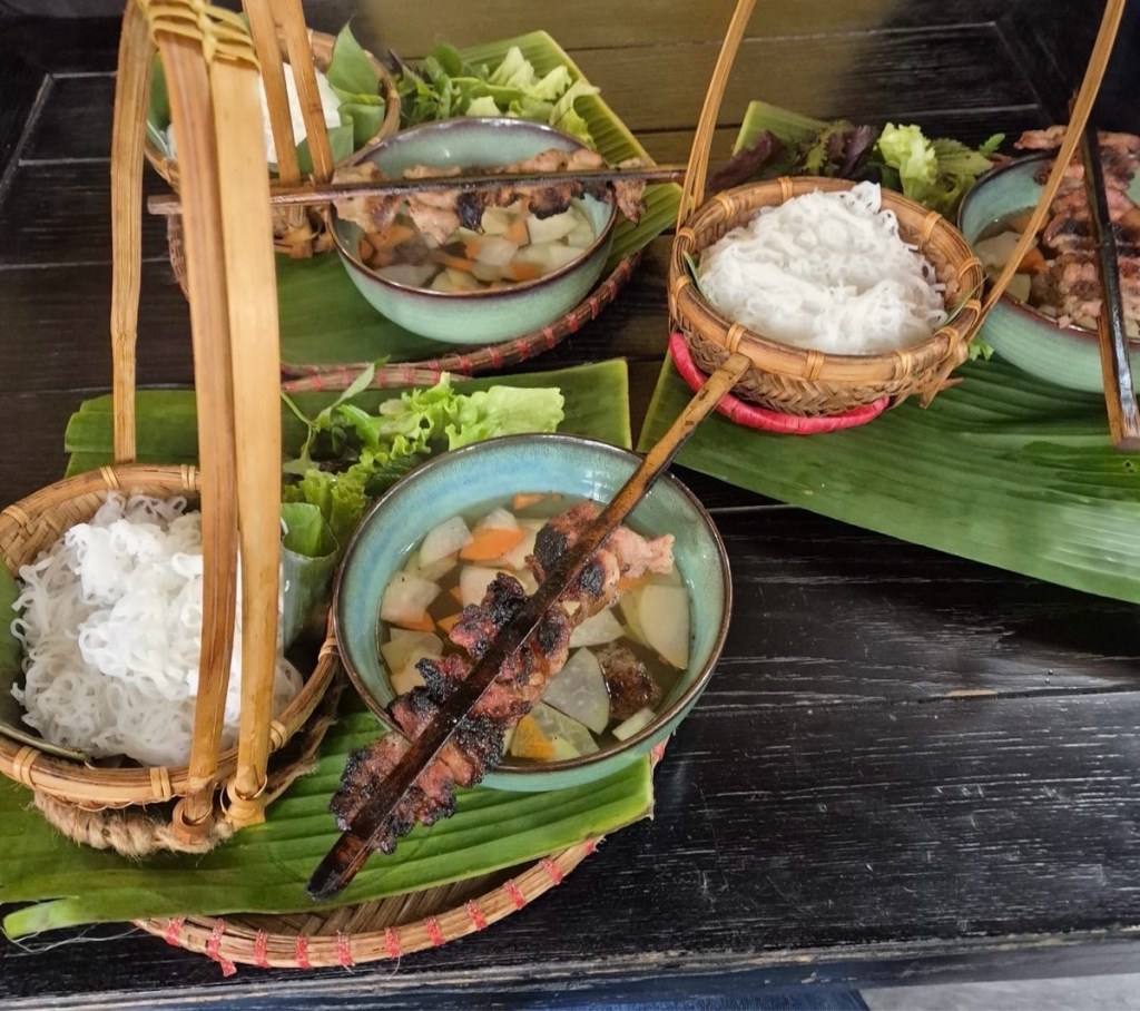 Our last stop was for lunch: famous Bun Cha grilled pork and noodles; beautifully presented in wicker/banana leaf/pottery.