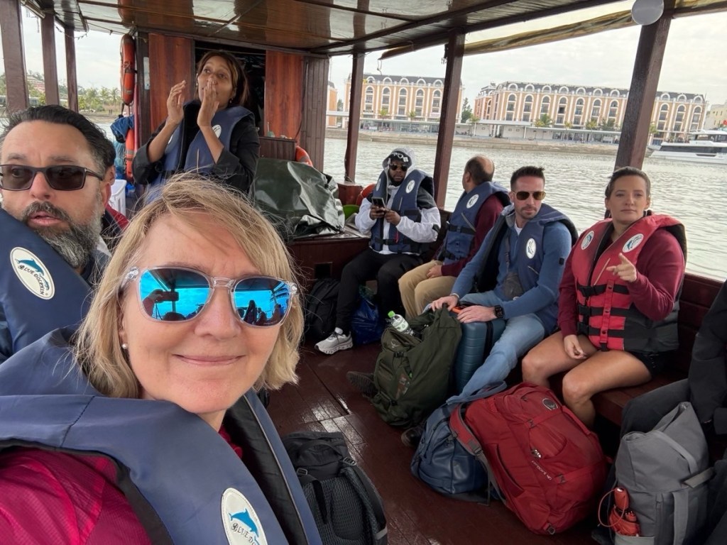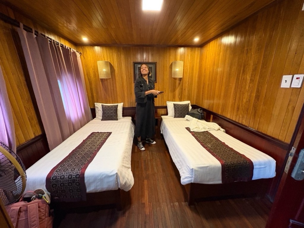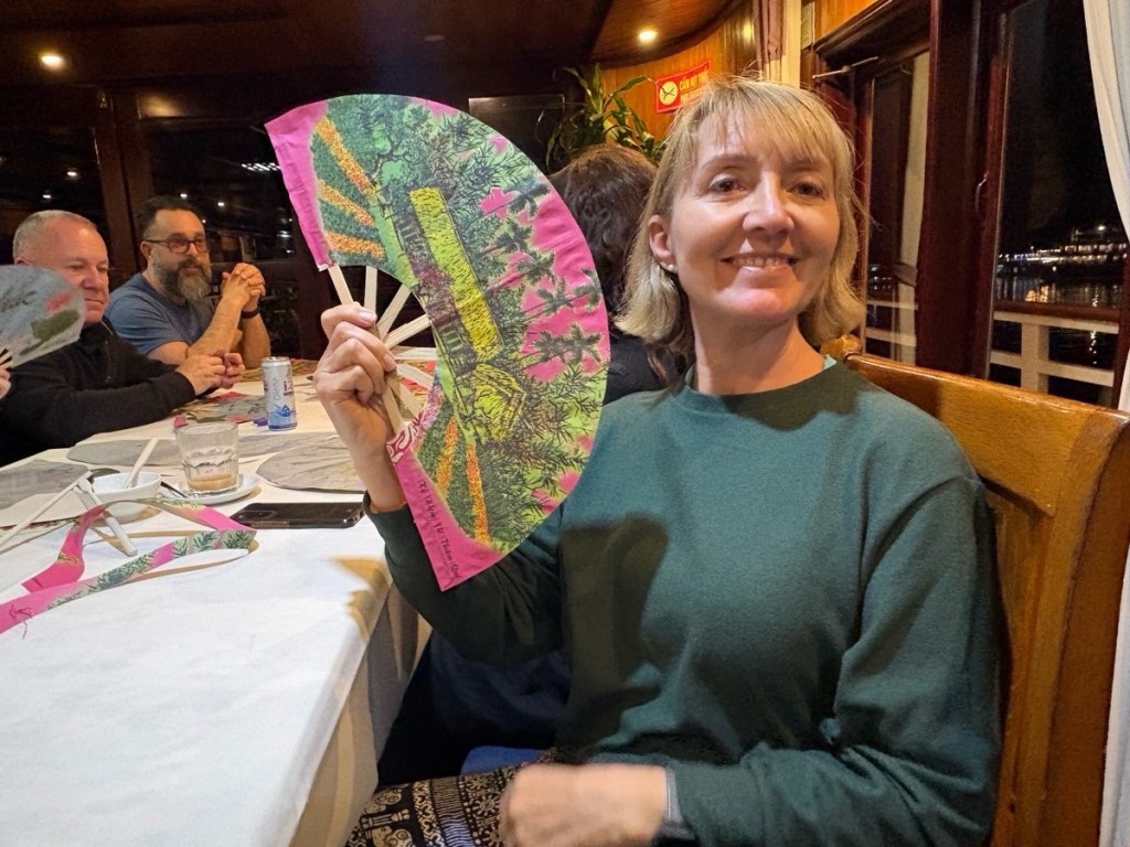 A fun fan making lesson after dinner, then my roommate Tannisha and I called it a night. We did not score a good cabin location. We’re near the stern, beside the wooden staircase and kitchen and engine room with its noisy generator. It might be a long night….