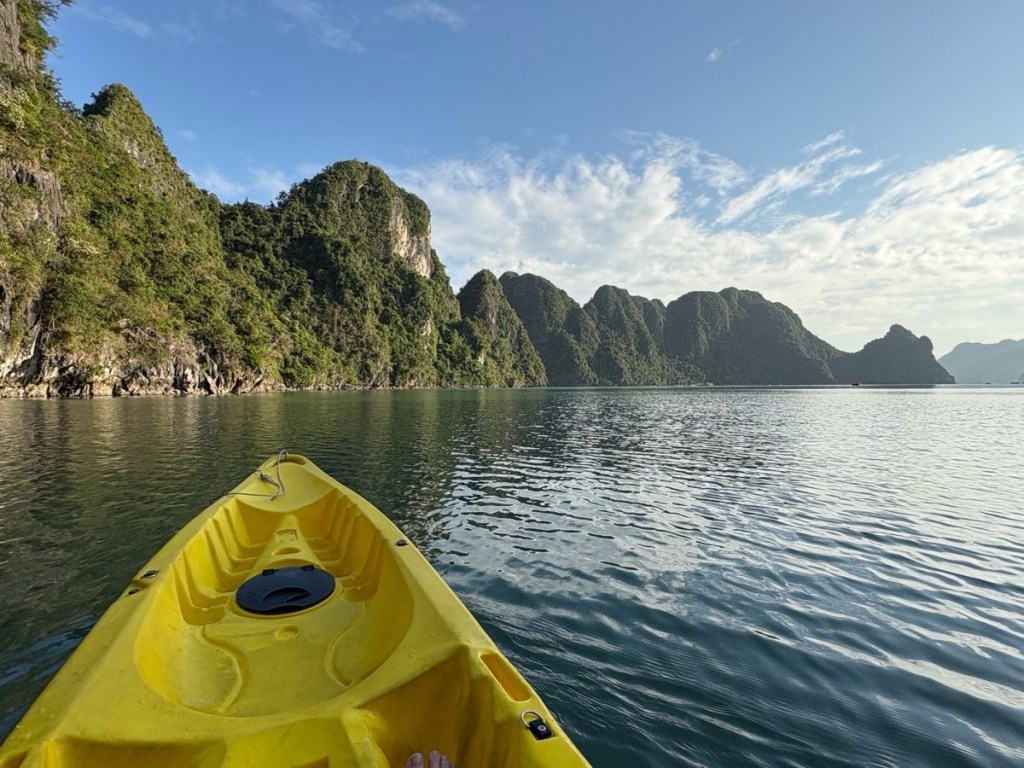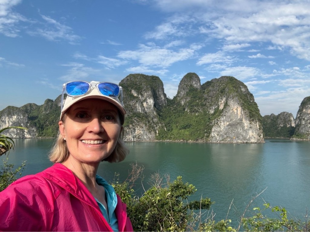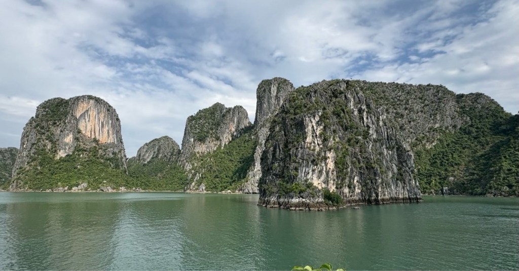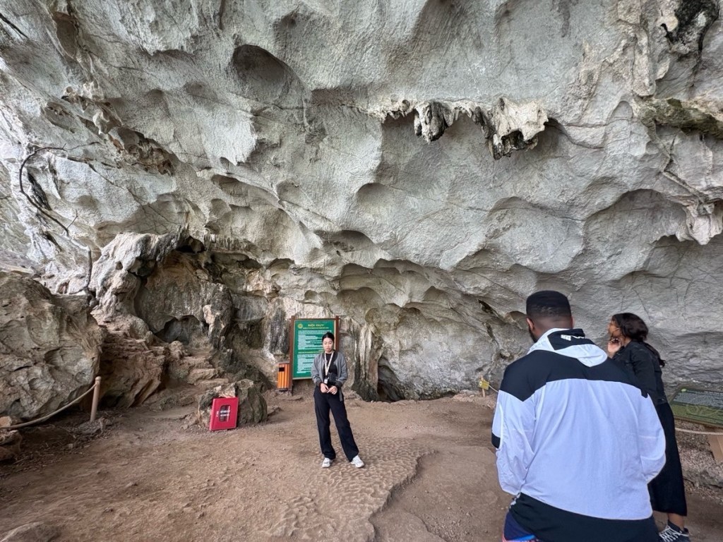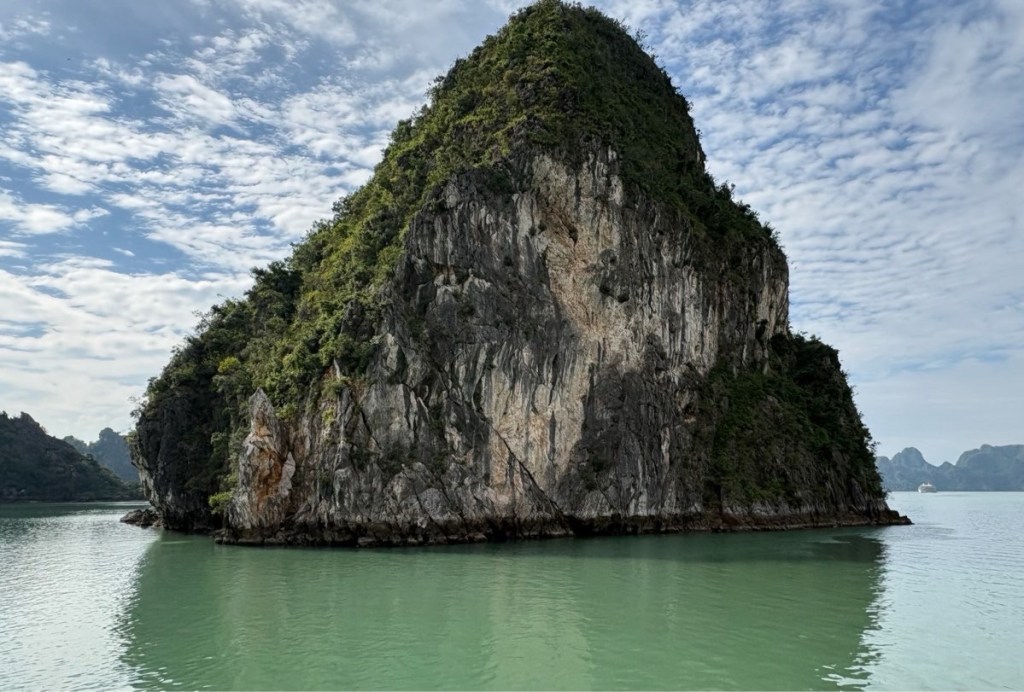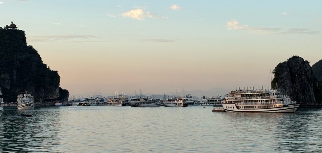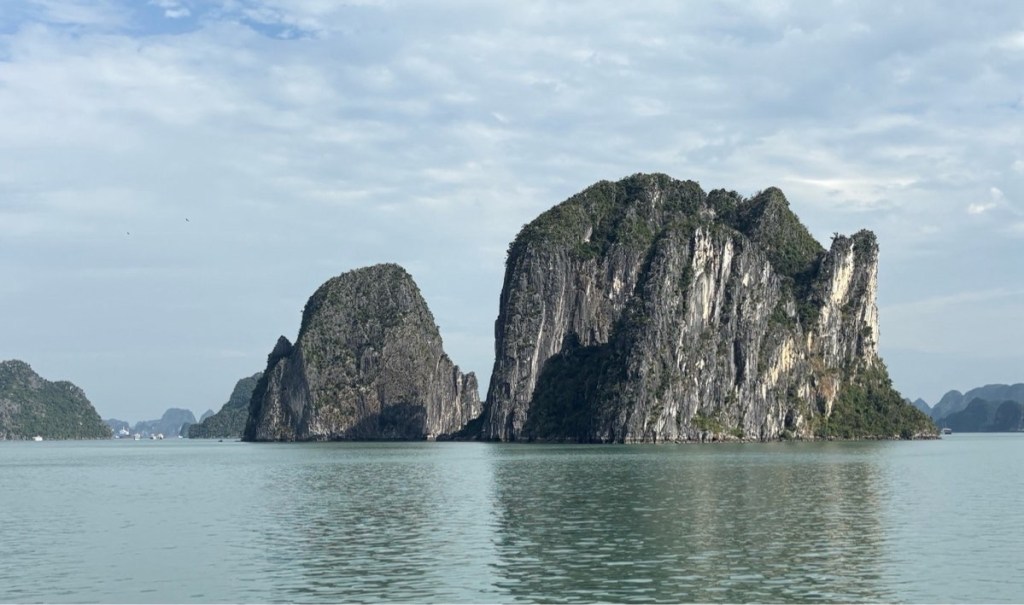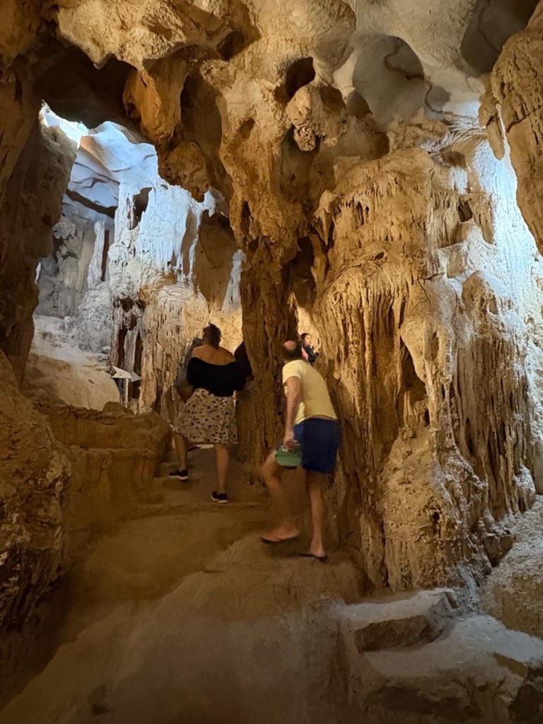 We arrived at the boat around noon and immediately set off to cruise Halong Bay. We had lunch underway then took the smaller launch over to one of the islands to explore a cave and viewpoint. My told us that since they are made of limestone they are riddled with caves, 1000’s of caves, and many of the larger islands are sunken in the middle, like this one.