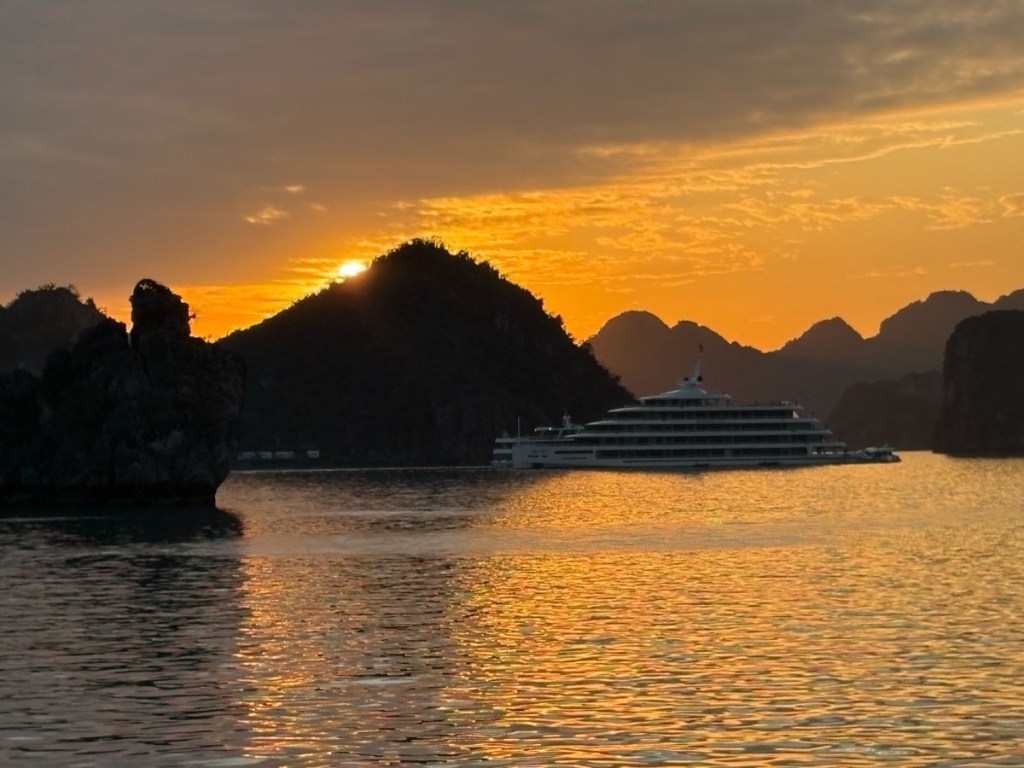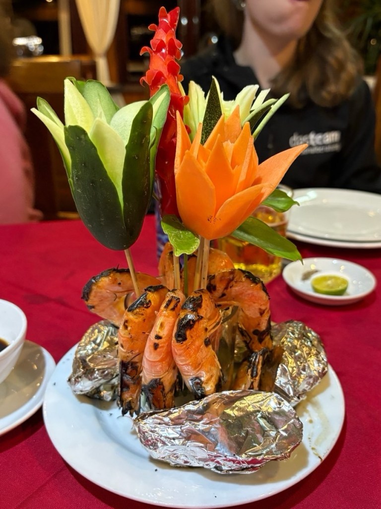 Drinks and conversation while we watched the sunset as we anchored up for the night. This is where the popularity of Halong Bay hit home, there are dozens and dozens of boats with lights flashing and music playing. Perhaps it was good the cold night brought us all inside and we forgot about the others. A great dinner – the chef went all out on his decorations!